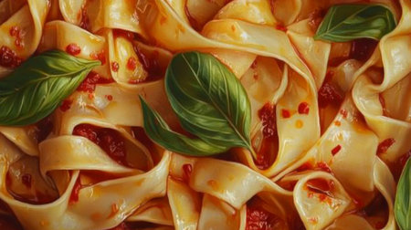 A mouth-watering scene featuring pappardelle pasta adorned with fresh basil and sun-dried tomatoes, perfect for food lovers and culinary enthusiasts.