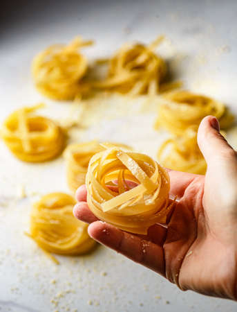 Female hand holds raw tagliatelle noodles on a white background. Minimalistic food concept. Top view