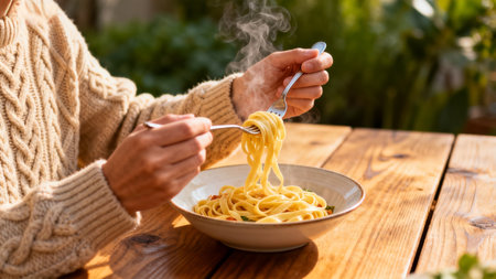 Person eating steaming pasta outdoors