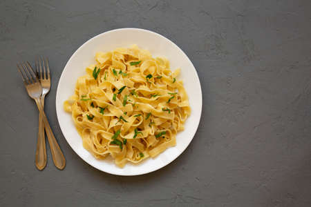 Homemade One Pot Garlic Parmesan Pasta with Parsley, top view. Flat lay, overhead, from above. Space for text.