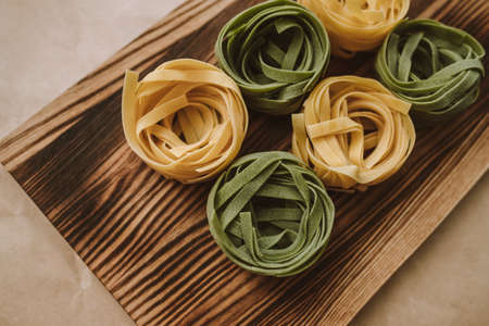 Italian wheat pasta tagliatelle, with spinach, on a board background. Top view. High quality photo