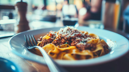 A stunning plate of pasta featuring a savory meat sauce and a sprinkle of cheese, perfect for showcasing delicious dining experiences in a restaurant setting.