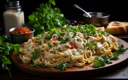 Close-up of creamy fettuccine alfredo pasta with sauce and seasoning. AI Generative.