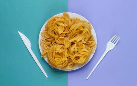 Different types of raw Italian pasta in a plate, fork and knife on colored background. Top view.