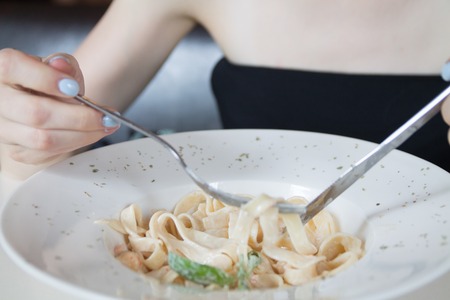 Italian pasta with chicken and cheese in a large white plate with young woman's hands holding a knife and a fork over it