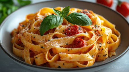 A vibrant plate of fettuccine topped with tomatoes and a basil leaf, evoking warmth.