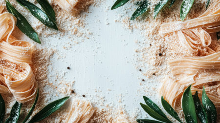 Pasta ribbons are elegantly arranged with fresh herbs and flour, evoking a sense of gourmet cooking.