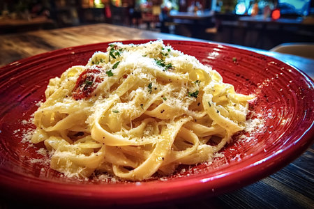 Tagliatelle pasta is garnished with grated parmesan cheese, dried tomatoes, herbs, and spices, served on a vibrant red plate in a restaurant setting, creating an inviting culinary scene
