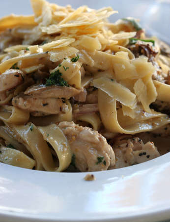 Close up of chicken and mushroom fettuccine with parmesan cheese