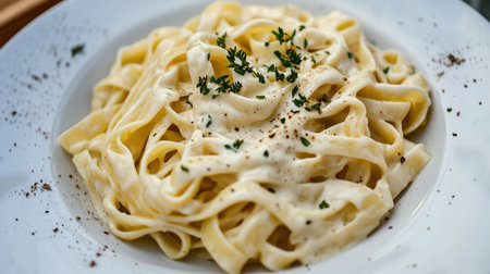 Enjoy a delightful serving of fettuccine pasta topped with a creamy sauce, garnished with fresh herbs. Perfect for a gourmet meal or comforting dinner.
