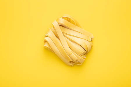 Flat lay top view fettuccine pasta on a yellow pastel background copy space