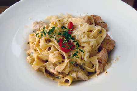 Italian pasta with white sauce basil and parmesan cheese in dark plate