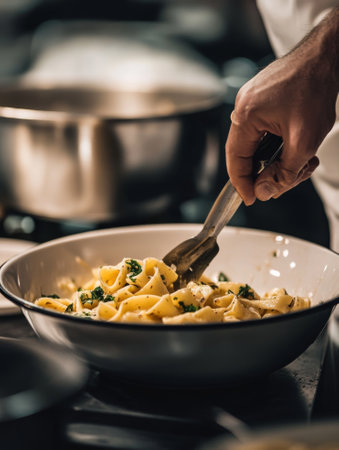 Chef preparing a pasta dish in traditional Italian restaurant kitchen - ai