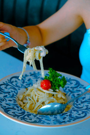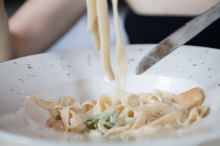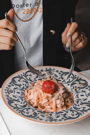 Italian pasta with chicken and cheese in a large white plate with young woman's hands holding a knife and a fork over it