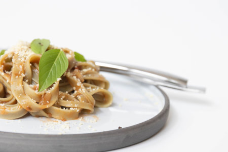 Pasta with mushrooms and cream sauce on a white background. Selective focus.