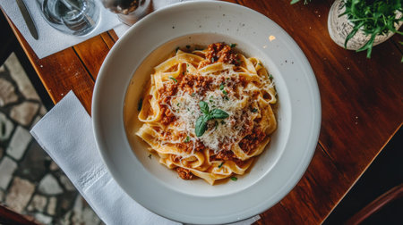 An inviting overhead image of a generous portion of tagliatelle pasta tossed in a flavorful bolognese sauce, garnished with a sprinkle of Parmesan and fresh herbs on a beautifully set table.