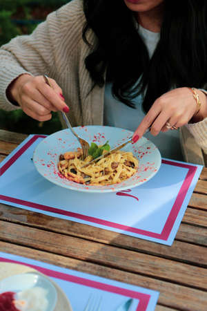 Italian pasta with chicken and cheese in a large white plate with young woman's hands holding a knife and a fork over it