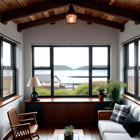 Living room with sea view from the window. Cozy home.