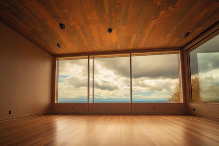 sky, with clouds moving overhead, pictured through large window in wood-paneled room, created with generative ai