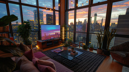 A spacious urban loft featuring large windows that offer a stunning view of the city skyline, complemented by indoor plants, creating a serene and stylish atmosphere.