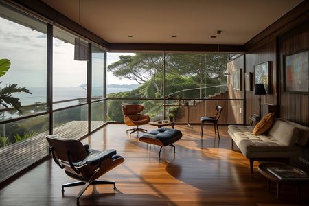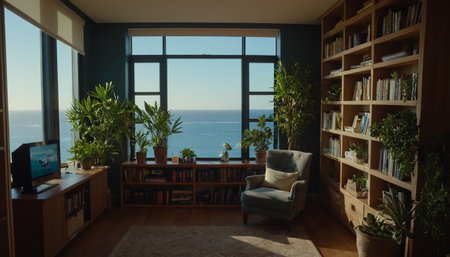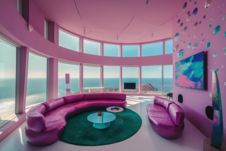 A living room filled with furniture next to the ocean. Generative AI image.