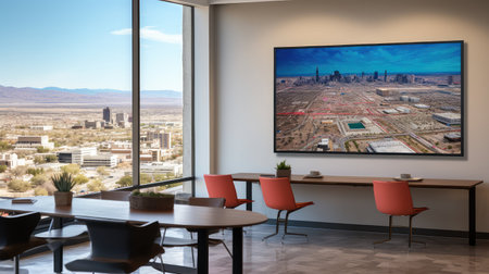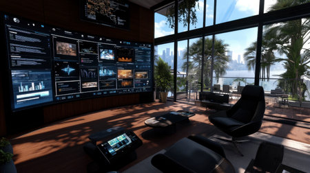 A modern workspace featuring advanced technology, a large digital screen, and stunning city views through glass walls. Bright, stylish, and inviting.
