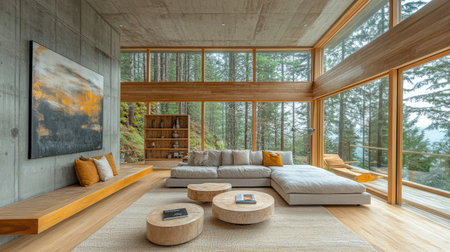 A large living room with modern furniture, large windows overlooking the forest and trees outside. The walls have an abstract painting on them, creating a warm atmosphere in harmony with nature. There is also wooden art display on one wall, adding to its rustic charm. A beige rug lies beneath it all, and there's some texture added through small round coffee tables made of natural materials like wood or stone. This space exudes tranquility and comfort. --chaos 30 --ar 16:9 --stylize 750 --v 6.1 Job ID: 642137a3-e2f7-47c5-a2da-b1e7db7f17bb