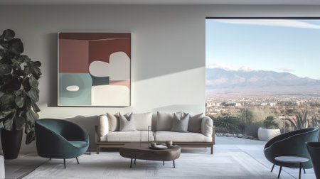 An AI generated illustration of Spacious living space with a prominent artwork on the wall