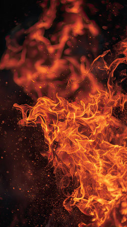 Witness the captivating power of fire with this intense image. A close-up view of fire flames takes center stage against a dark black background, creating a mesmerizing and dynamic composition. The vibrant and flickering flames create a sense of energy and intensity, while the black backdrop adds depth and drama to the scene. Perfect for projects related to heat, energy, passion, danger, and the elemental force of fire