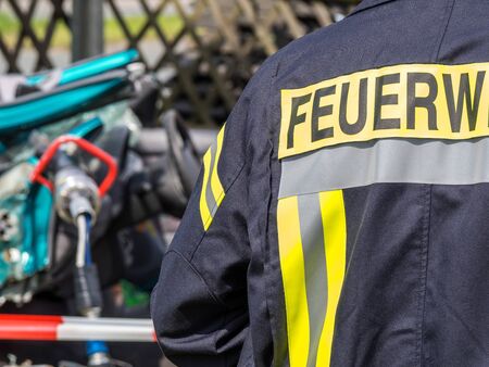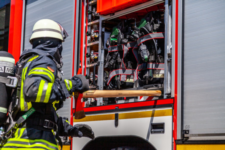 HANNOVER / GERMANY - JULY 6, 2017: German fireman takes an object from a fire engine