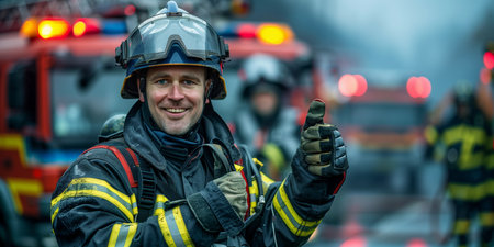 A firefighter gives a reassuring thumbs-up in front of a fire truck, embodying bravery and readiness.