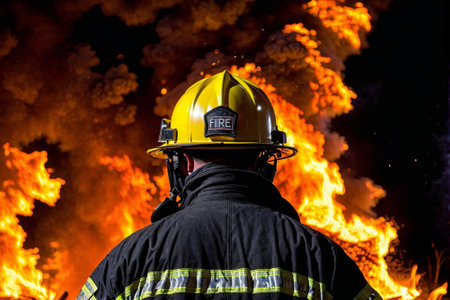 A firefighter poses with determination in front of blazing flames during an emergency response.
