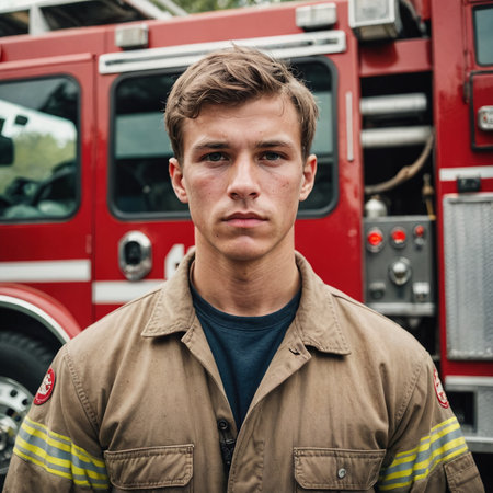 Serious Young Firefighter in Uniform Standing Near Fire Truck