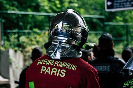 Paris France May 04, 2019 View of a French firefighters walking in the street during protests of the Yellow jackets against the policy of President Macron in Paris on saturday afternoon