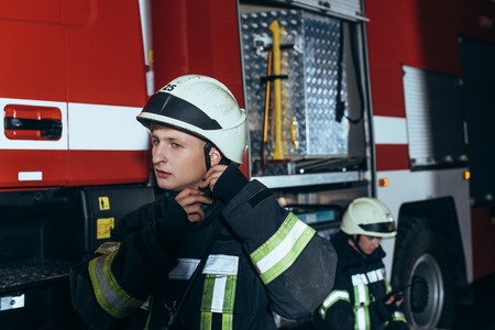 Portrait of serious fireman looking to camera in fire uniform near fire truck