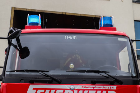 Neumuenster, Germany - 24.September 2022: Vehicles of the Neumuenster fire brigade with blue lights in front of the shopping centre
