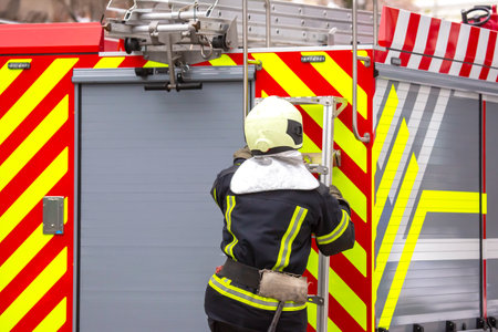 firefighter man works on his fire truck. fire safety service