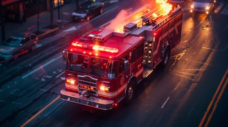 A fire truck responding to an emergency at night in the city, with lights flashing and urgency in the scene