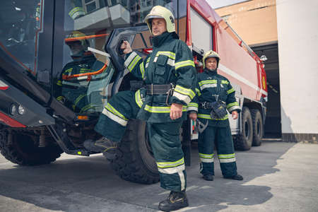 Close up view. Female firefighter in protective uniform standing near truck