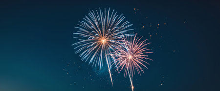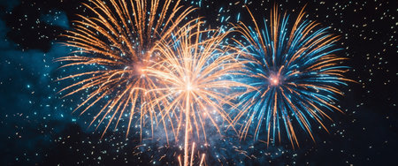 A vibrant display of fireworks lights up the night sky. Large bursts of light illuminate the dark canvas above, creating mesmerizing spectacle of color and movement. Generated AI. Festive background.