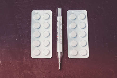 Minimalistic medical still life. Thermometer and white pills on a blue background