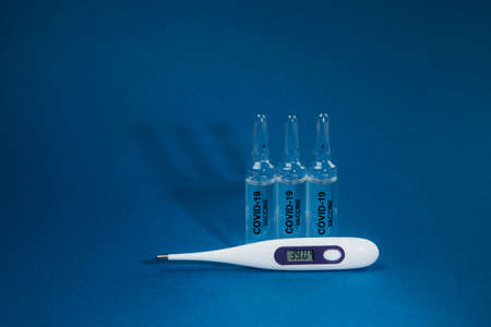 Hand in glove holding a thermometer of the health of medicine on a blue background. A place for text or design.