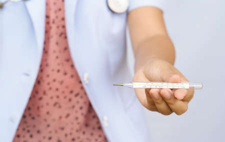 Closeup of thermometer in the hand of medical worker.