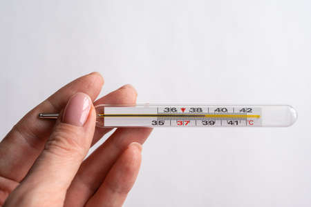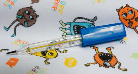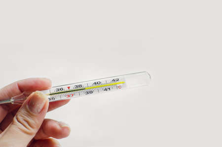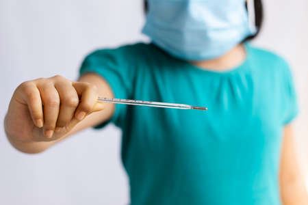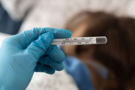 Woman hand holding mercury thermometer with high temperature on background of child sick with flu closeup