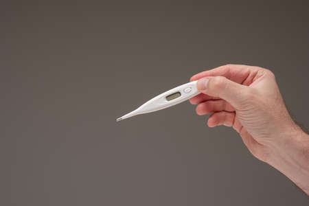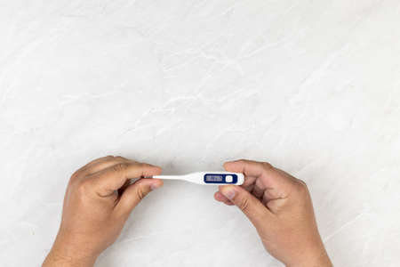 close up of man hand holding digital thermometer.