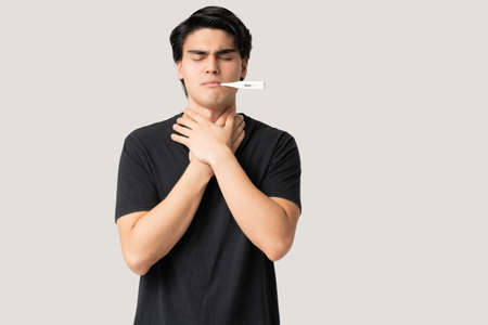 Caucasian young woman checking temperature with thermometer and touching throat