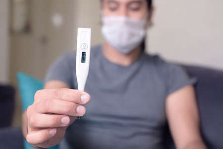 Man holds a red fever thermometer with high temperature in his hand, blurry face