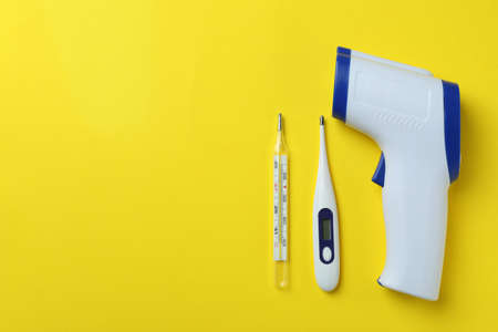 On a yellow background, there are four types of thermometers - liquid crystal, clinical, electric and mercury. Concept of health care and medicine. Copy space