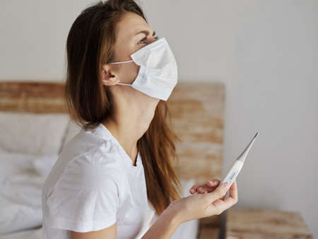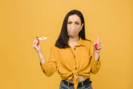woman with mask holding a digital thermometer high temperature on yellow background