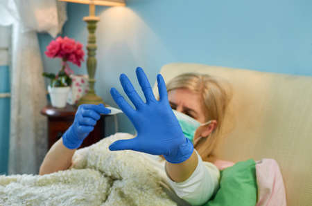 Young woman aged sick with chickenpox, holds thermometer and measures temperature